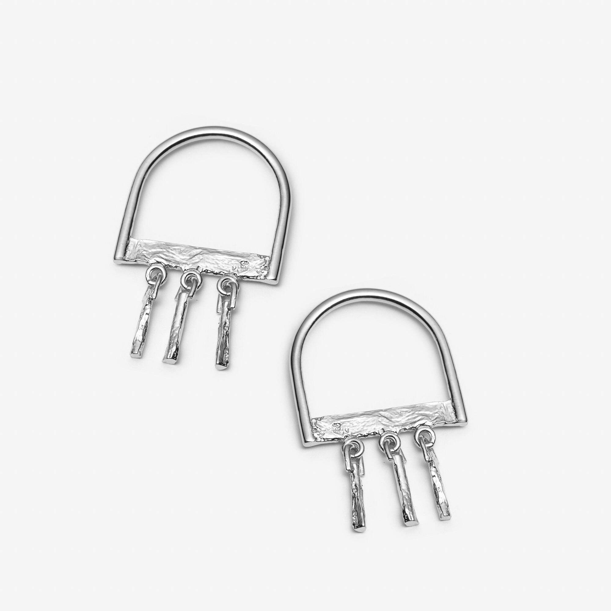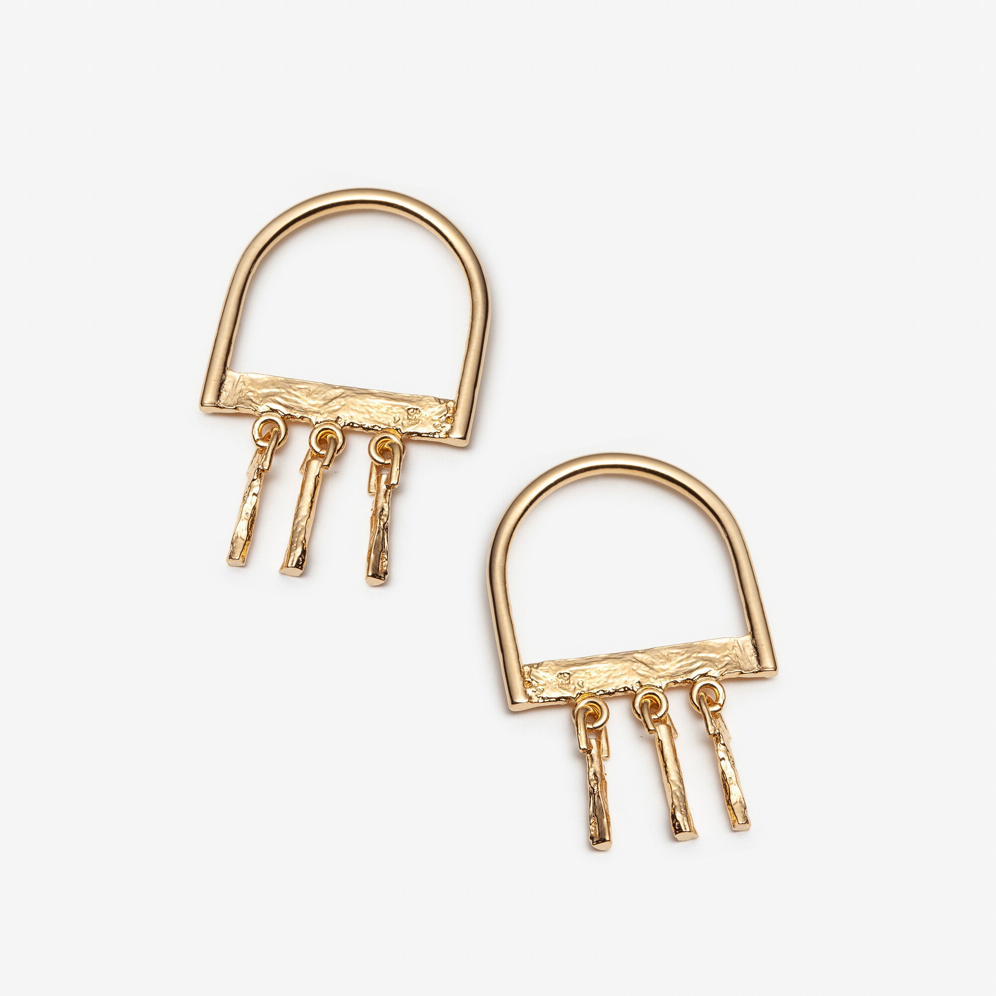 These earrings are shaped like an upside-down U with three metal charms hanging from it. Lightweight despite their medium length, they add a festive element to any sweater, tunic or dress.