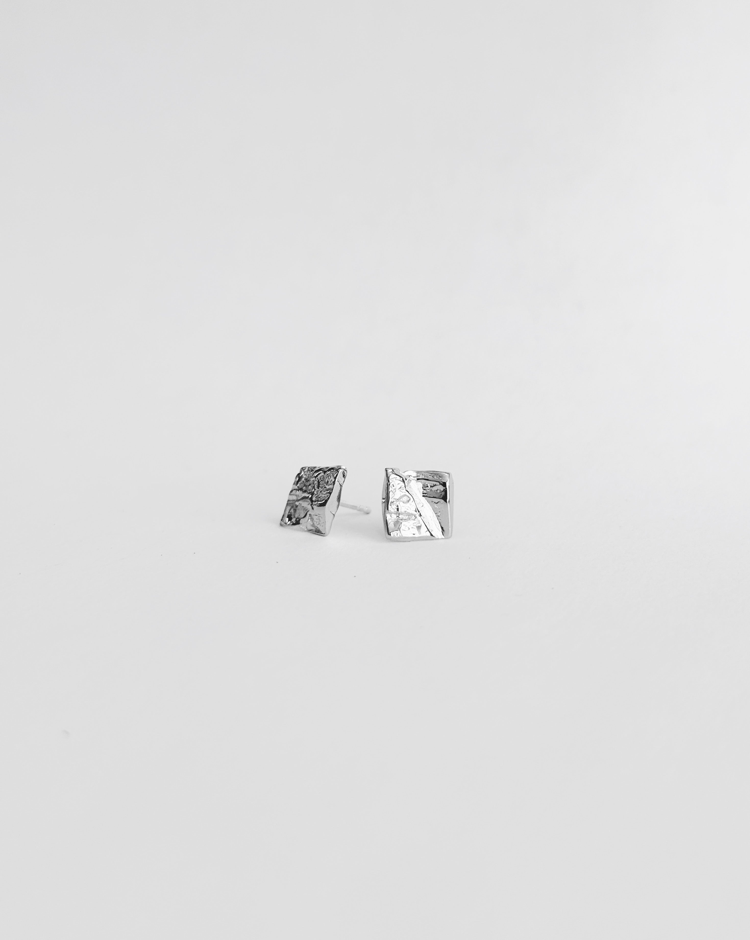 These square stud earrings resemble each other without being identical. One may be slightly more angular, the other softer and rounded.